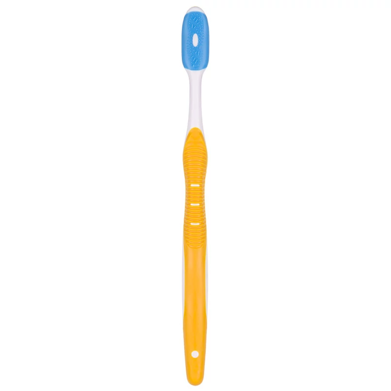 سایر مشخصات: -طراحی زبان شوی در پشت سر مسواک با هدف پاکسازی زبان از باکتری های مولد بوی بد دهان -طراحی ماساژورهای لثه در سر مسواک جهت ماساژ لثه ها و بهبود گردش خون در آنها -طراحی برس نامسطح و دارای انحنا برای مسواک با هدف پاکسازی تمام سطوح دندان ها و فضای بین دندانی -انتهای گرده شده الیاف مسواک جهت جلوگیری از آسیب به مینای دندان و لثه ها -کنترل راحت مسواک در دست به دلیل طراحی ارگونومیک آن دارای رنگ بندی متنوع و اسپرت